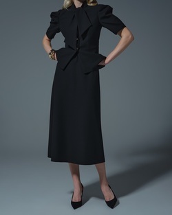 Жакет с акцентными рукавами и мягко драпированным воротником-бантом. Золотые пуговицы выделяют линию силуэта и добавляют графичности. Приталенный крой подчеркивает фигуру, создавая элегантный и выразительный образ, который гармонично сочетается как с юбкой из комплекта, так и с другими элементами гардероба.